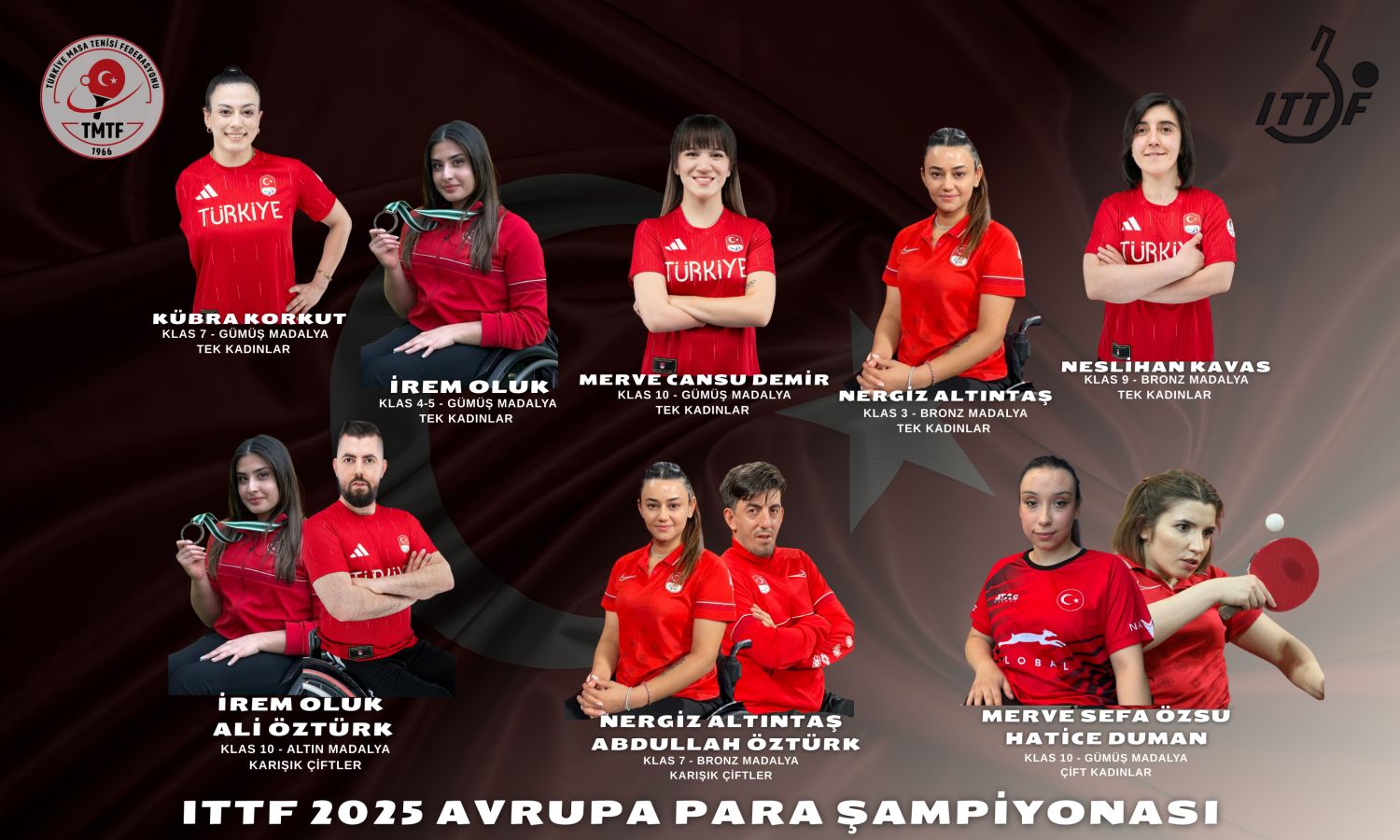 20–25 Kasım 2025 tarihleri arasında İsveç’in Helsingborg kentinde düzenlenen ITTF 2025 Avrupa Para Masa Tenisi Şampiyonasında millî sporcularımız hem tekler hem de çiftler kategorilerinde önemli başarılara imza attı. Sporcularımız şampiyonayı toplam 8 madalya ile tamamlayarak önemli bir başarıya imza attı.